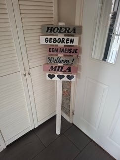 We kunnen heel veel op voor maken, behalve de tekst met naam en datum, ik kan als u de blauwe of roze kleur daarvoor kiest de rest alvast maken en wacht ik het af zo gauw u me mailt of belt ga ik meteen de laatste bordjes maken zo is het op tijd bij u, de volgende dag kunnen we hem dan leveren, met verzenden duurt het even langer!
