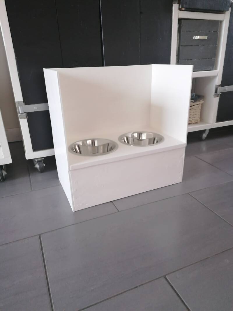 Een voerbak standaard met hoge achterwand en hand greep, de achterwand is circa 65 cm hoog zodat u makkelijk de standaard kan optillen.