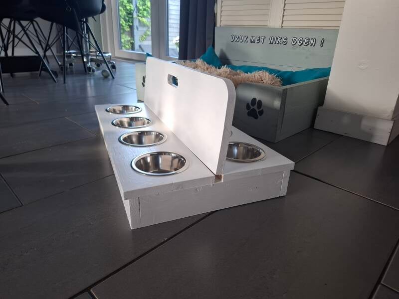 "De puppy voertray van rwhoutidee.jouwweb.nl is een fantastische oplossing! Geen gedoe meer met vechtende puppy's, en het staat ook nog eens prachtig in mijn interieur."