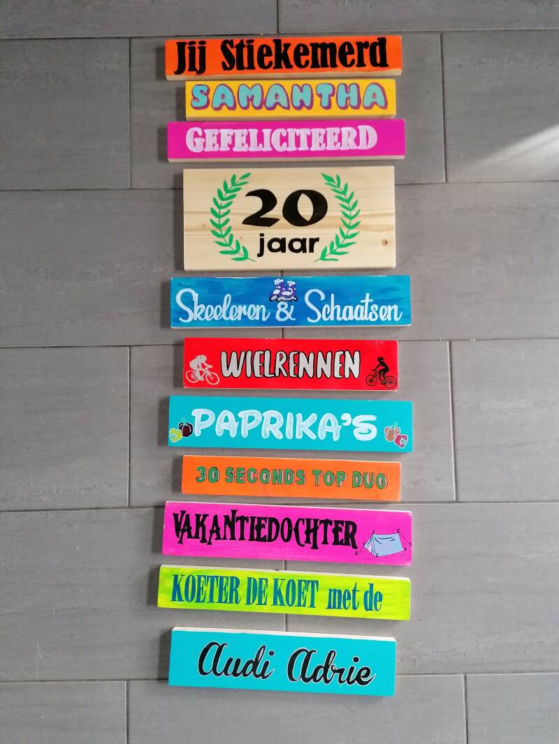 Bij de prijs zit inbegrepen het schilderen, lakken en tekst, 1 simpele afbeelding bij meerdere afbeeldingen dat kan voor meerprijs