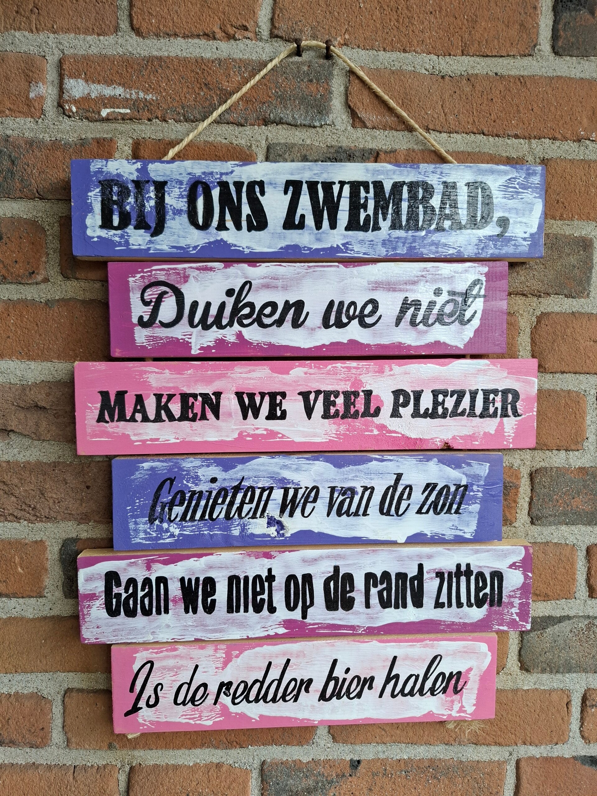 bij je zwembad moet natuurlijk wel een leuke tekstladder hangen, heerlijk fleurig.