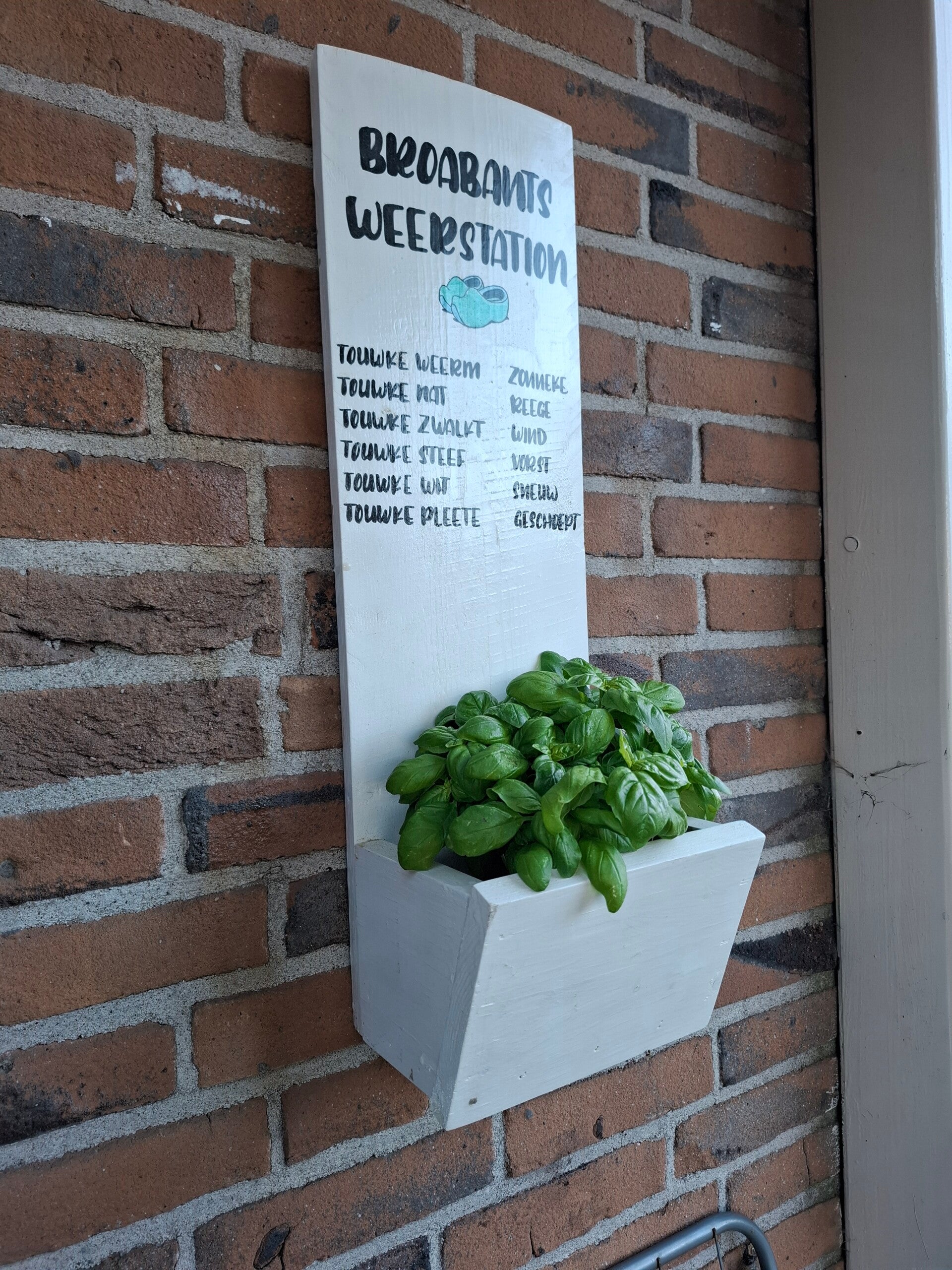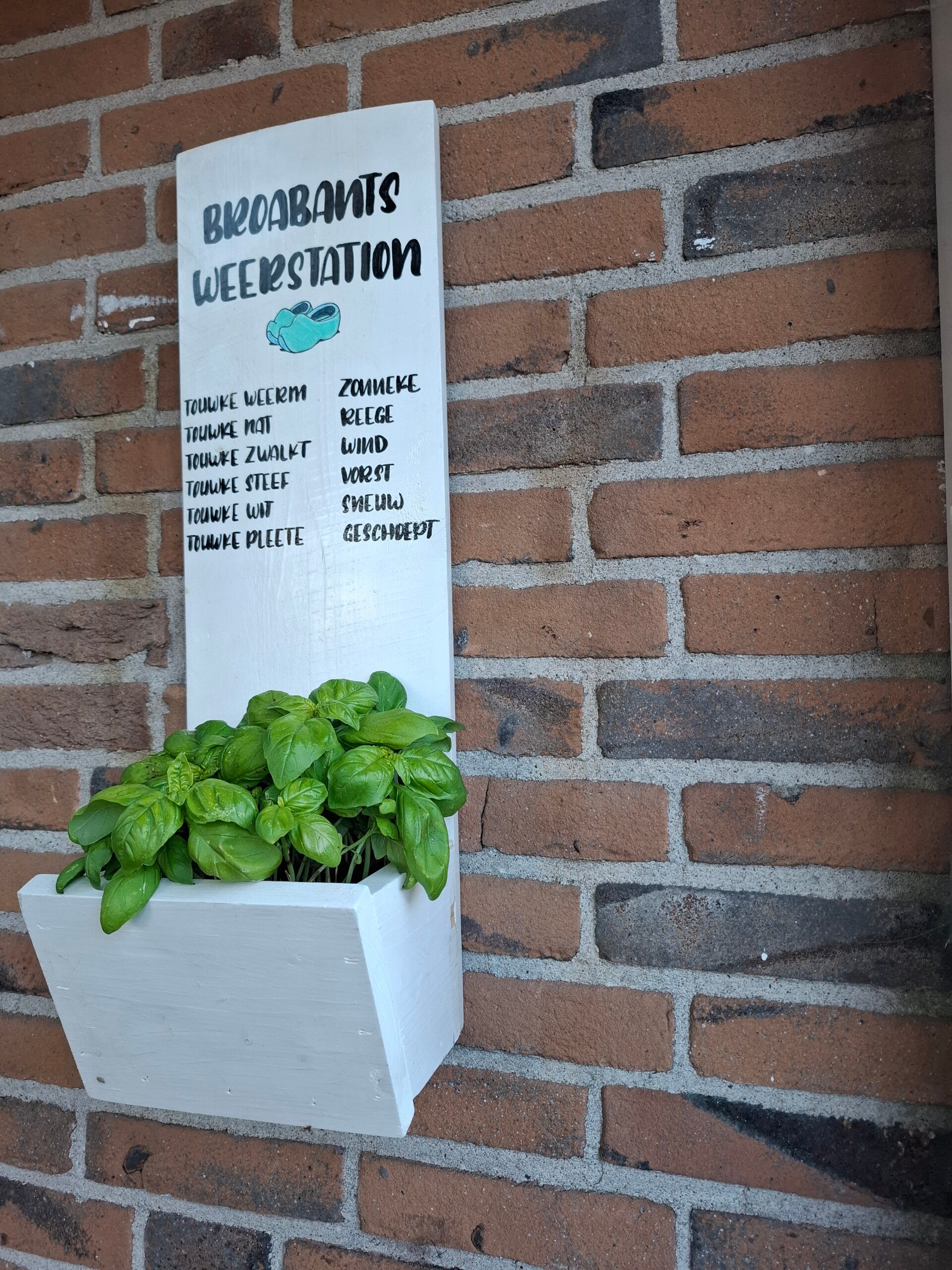 plantenbak voor aan de muur met Brabants dialect weerstation
