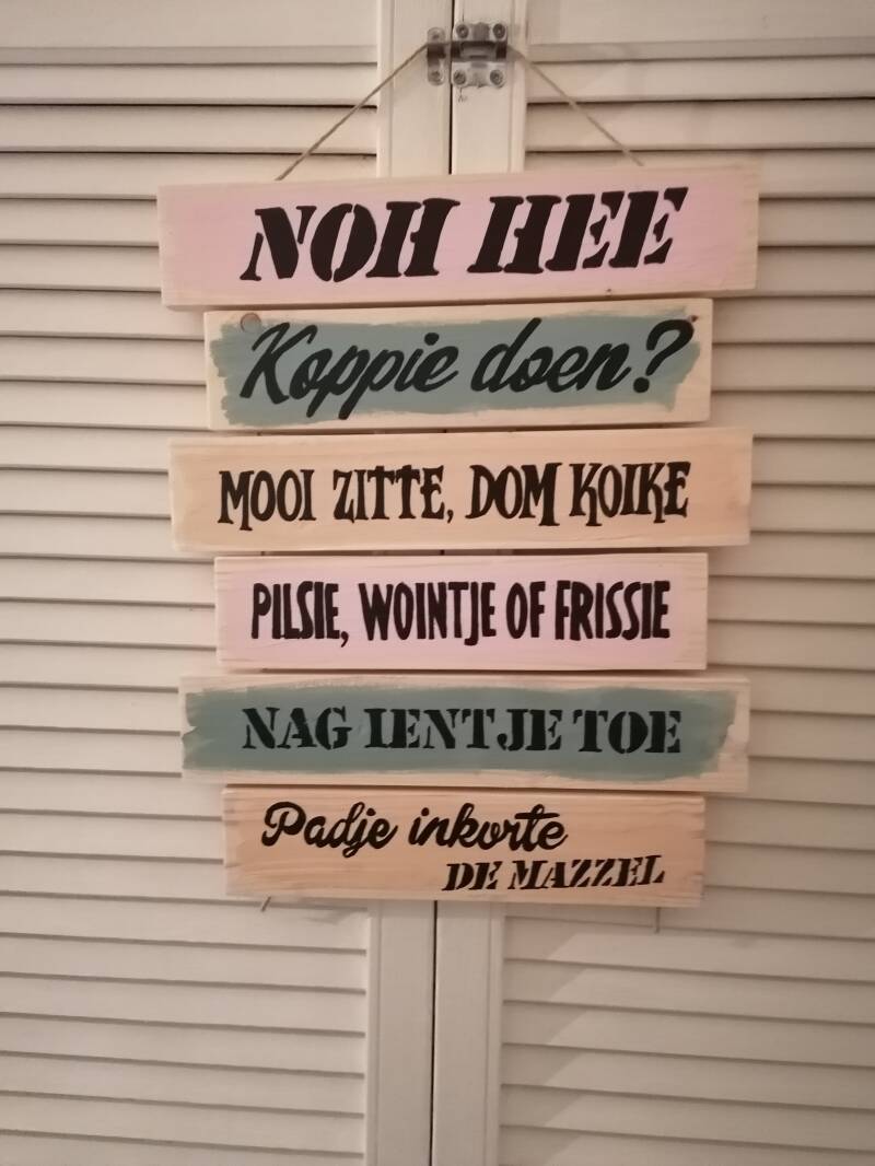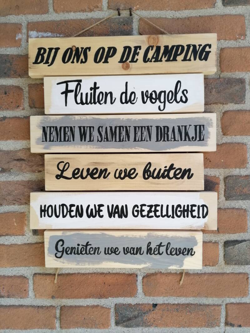 De tekstladders zijn gemaakt van vurenhouten planken die we geverfd en gelakt hebben